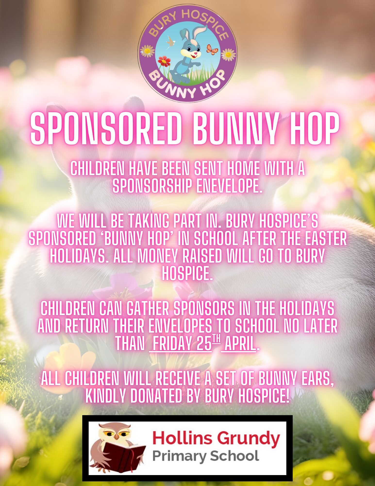 After our Easter break, we will all be taking part in a sponsored ‘Bunny Hop’ to raise money for Bury Hospice, a local charity that supports the local community, especially those affected by severe illness.